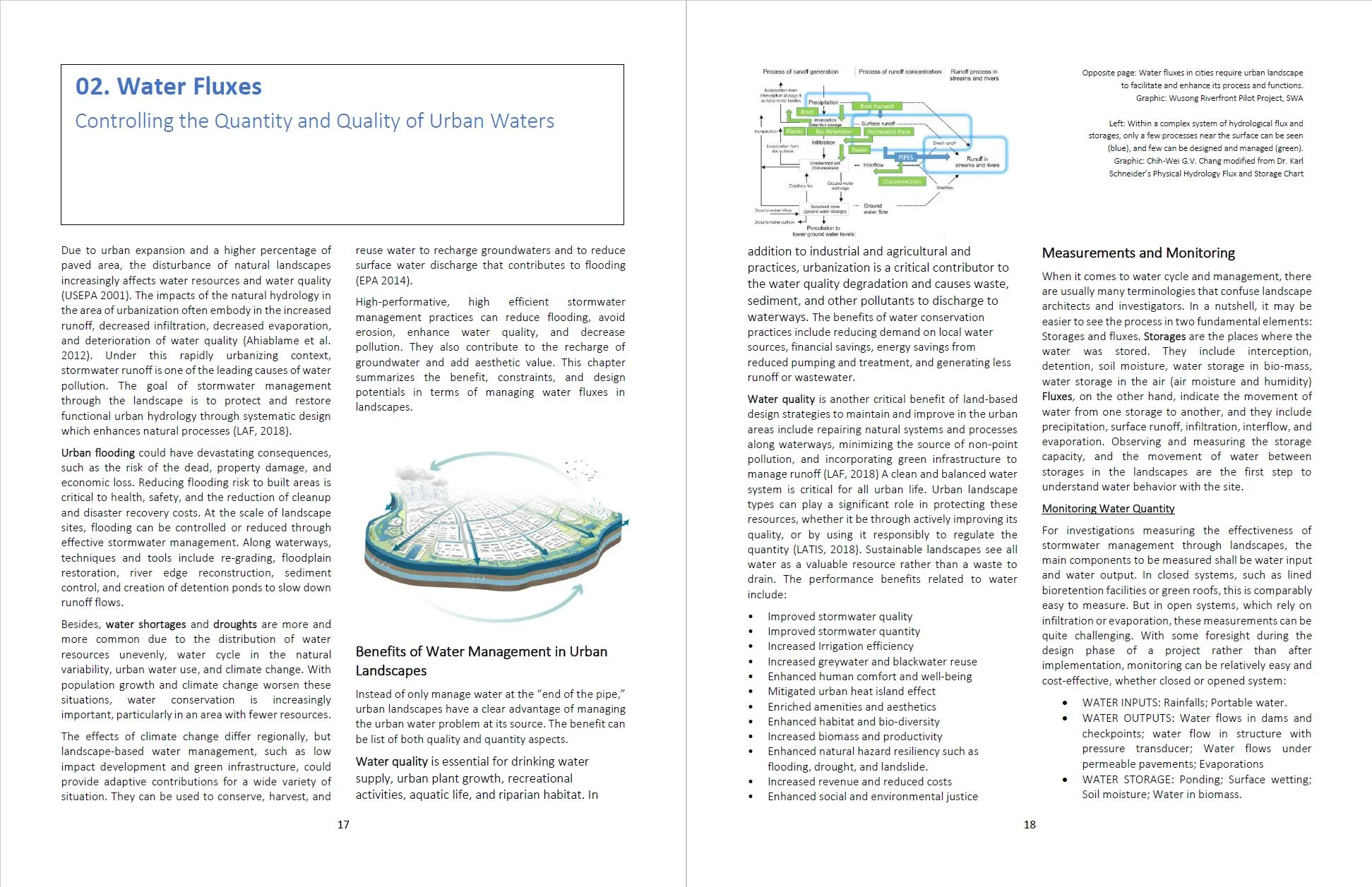 The main content was constituted by 10 chapters. Chapter 1 starts with site selection and specific concern of each typology and potentials. Chapter 2 to 6 focus on the direct and indirect materials and medium that landscape architects engage in their practice, which include water, soil, vegetation, and atmosphere. Chapter 7 and 8 are about the land transformation process, which includes construction and maintenance. And finally, Chapter 9 and 10 loop back to the essential aspects of economic and social benefits and how urban landscape respond and engage in the dynamics. Even though each chapter has its own thematic focus, all of them are inter-related and inseparable. Case studies and their images are used throughout the guideline to support a better mental image and reference. But it is important to note that, this guideline did not take a case-study based approach. In fact, the de-coupling individual case from an overall framework is crucial to achieving an un-bias and balance guideline.